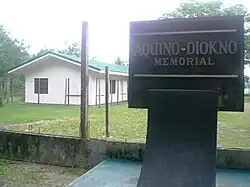 Diokno and Aquino, whom the dictatorship considered their foremost opponents, were later handcuffed to chopper seats, blindfolded, and flown out to be solitarily confined at Fort Magsaysay, located in the municipality of Laur, Nueva Ecija. They remained confined to Fort Magsaysay for exactly thirty days. They both learned of each other's presence through singing. One of them would frequently sing the national anthem Lupang Hinirang or "Chosen Land," to which the other would reply by singing Bayan Ko or "My Country" to prove he was still alive.[45] From the fish being served by the cook Aling Cely, who later became the museum curator of the converted national memorial called the "Aquino-Diokno Memorial," Diokno was able to correctly deduce that he was detained in Nueva Ecija, particularly in Fort Magsaysay.[46] To tally the number of days, Diokno used rope knots from his mosquito net as well as the back of a soap packaging box and crossed out each day in the manner of a calendar.