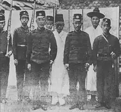 The Joseon Army, as it existed in the early 1890s, consisted of about 3,000–50,000 soldiers at the time of the Donghak Peasant Revolution.[7] In January 1894, the modernized army was deployed against the Donghak Peasant Revolution but lost many battles in the beginning due to their sheer numbers and innovative tactics. When Gojong requested help from the Qing to suppress the rebels, the Japanese sent troops to Seoul, demanding the Joseon Government send the Qing back. The government refused, and Japan stormed Gyeongbokgung. Despite resistance from Capital Guards Command, Japan occupied the palace and established a pro-Japanese government beginning the Gabo Reform and the Sino-Japanese War.[8] As per the Gabo Reform, the government disbanded the Capital Guards Garrison. Japan allied with the Joseon Army and finally suppressed the Donghak rebels in December 1895. The Japanese forced the Qing out of Joseon after winning the war.