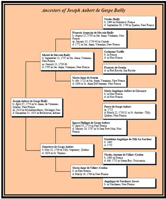 Joseph Bailly was an early fur trader on the Great Lakes. He and his children had significant influence as the region transitioned from English colonialism to frontier expansion of the United States. He was born Honore Gratien Joseph Bailly de Messein on 7 April 1774 in Verchères, Quebec; a village which originated with a land grant to his great-great-grandfather Francois Xavier Jarret, Sieur de Vercheres in 1672.[1] It is located 20 mi (32 km) up the Saint Lawrence River from Montreal, on the opposite bank. Bailly was a sixth–generation French-Canadian, descending from Jehan Terriault and Perrine Brault, who were original colonists in Acadia in 1637. Bailly's great-grandfather Nicholas Antoine Coulon, Sieur de Villiers was a trader and Army officer who was killed by Meskwaki people on the shore of Green Bay, Wisconsin in 1733. His uncle, Father Charles-Francois Bailly de Messein, spent more than twenty years as a Catholic missionary to the Mi'kmaq Indians of Nova Scotia, and was appointed coadjutor Bishop of Quebec in 1788. Following the family interest in the fur trade, Joseph Bailly received an advanced education in Montreal, and served a clerkship with the North West Company. In 1792, at the age of 18, he finished his education, and entered the fur trade at Michilimackinac. Although from a prominent family, they had little money. His father died in 1795, and Joseph became the main support of his mother, younger brother, and sister for several years.[2]