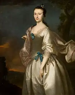 He seems to have been the son of a painter, and to have had a studio in Boston from 1755 until 1765; among his patrons were many important early American families, including the Apthorps, Amorys, Bulfinches, Lowells, Ewings, Saltonstalls, Winthrops, Winslows and Otises of Boston. Blackburn spent time in Bermuda (1752–1753), Newport (1754), Boston (1755–1758), and Portsmouth (1758–1762). In late 1763 he returned to London and painted portraits in southwestern England, Wales, and Dublin between 1768 and 1777.[2] Approximately one hundred fifty of Blackburn's portraits survive.[2] He excelled at painting textiles (i.e., representing the shimmer of silks, the texture of laces, and the folds of fabrics).[2]
