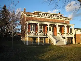 The two-story Joseph F. Glidden house is constructed from locally fired brick, which is relatively soft. The softness of the brick has caused it to weather in a non-uniform fashion.[4] The brick is said to have been fired at a small brickyard which once existed on the Kishwaukee River in DeKalb, near the present-day Lincoln Highway bridge.[4] The home stands on a stone foundation and was designed by local carpenter and eventual barbed wire competitor to Glidden, Jacob Haish.[2] Construction was completed in 1861 and the home is a prominent example of Illinois French Colonial architecture.