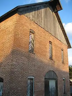 The east bay of the barn contains an animal stall in its northeast corner and a fully enclosed office in its opposite corner. The second-floor hayloft is supported by the two massive transverse beams.[14] The full-sized loft is accessible via an enclosed staircase against the south wall. The building's exterior roof is fully supported by the brick walls. The result is a loft which is an entirely open space save for some pole and beam construction supporting the laminated beams, which act as tie rods at the base of the roof.[14] The barn roof is a common gable roof pitched at a 45 degree angle, it was originally covered with wooden shingles, those have been replaced over the years with asphalt.[14]