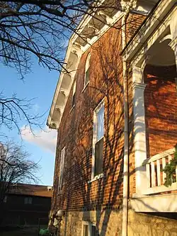 The west facade of the house, note the cornice.