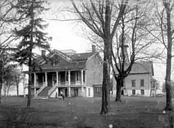The land where the Glidden Homestead stands once held a log structure, which Glidden lived in when he first came to DeKalb at the beckoning of his cousin Russell Huntley.[3] The house was built in 1861 for barbed wire entrepreneur Joseph Farwell Glidden. As his personal residence, the house, and its accompanying barn, were closely associated with his invention, really just an improvement, of barbed wire. Glidden's improvement upon a wire board fence developed by Henry Rose was of vast importance in the settlement of the United States west of the Mississippi. It was after Glidden saw Rose exhibit his wire at a fair in 1873 that he was struck with the idea of attaching barbs to wire strand fencing.[5] Glidden is said to have experimented with some of his ideas in the basement kitchen of the Glidden House.[5] He noticed that whenever he tried to attach barbs directly to strands of wire they slid along the length of the wire; Glidden realized he needed a way to crimp the barbs. He began tinkering around the home's kitchen. Glidden fit two hair pins to the shaft of a coffee mill, one centered and the other off-center. He found that by placing the wire between the pins and turning the crank a uniform barb resulted.[5] How to crimp the barbs to the wire was solved, in the barn, by tying one end of the wire and another length of wire to a poplar tree on the grounds of the Glidden House and the other ends of the wires to a grindstone. The grindstone was used to twist the wires together and prevent the barbs from slipping.[5]