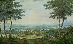 After his early education in Maryland, Farington went to study with Richard Wilson in London in 1763. In 1764, 1765, and 1766 he won "premiums" from the Society of Artists for his landscape drawing; he became a member in 1765. He joined the Royal Academy when it was founded in 1769 and was elected an ARA in 1783 and an RA in 1785.[1] Farington contributed works to the Academy's exhibitions every year until 1801, but only occasionally between 1801 and 1813. He was an active member of the Academy and sat on several important committees, including the one which determined where artworks would be hung during the exhibitions. He also acted as executor for the estate of fellow Academician, John Webber.[4] In 1793 he became a fellow of the Society of Antiquaries and helped establish the British Institution. He assisted in the Thomas Gainsborough, William Hogarth, and Richard Wilson exhibitions in 1806.[1]