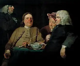He painted portraits, conversation pieces and history subjects. He worked for artistocratic clients as well as middle-class patrons.[1] His ability to give a group portrait the informal outlook of a conversation piece is demonstrated in his Mr Oldham and his Guests (National Gallery, London). It shows Mr Oldham, who appears to have just arrived, standing at the extreme left of the painting, with his arms folded over the top of a chair. He is looking with an expression of barely concealed amusement at his guests who are already seated at a table.[4] Highmore also made portraits of his children. His portrait of his daughter Susanna (c.1740, National Gallery of Victoria) is remarkable in the richness of the visual details and the confident glance which the sitter casts towards the viewer.[5] For his portraits, he employed the specialist drapery painter Joseph Van Aken to paint the dresses and costumes of his sitters.[6]