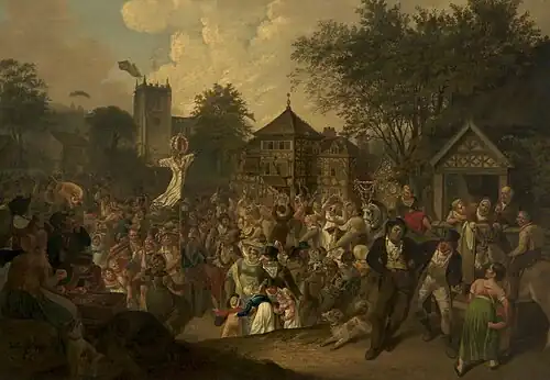 His figure drawing in particular was noted as exceptional by contemporaries—he would venture out into the city and countryside, sketch particular people who caught his eye, and then incorporate them into his later paintings.[4] This is reflected in his paintings of the Eccles Wakes—originally a pious medieval rushbearing festival, by the 19th century it had grown into a drunken three-day funfair featuring blood sports like bear-baiting.[18] Parry produced a series of highly stylised paintings of the Wakes over a span of several years, depicting crowds of raucous partygoers in an Eccles that was more antiquated and idealised than in reality.[19][20][21][22] His final depiction, Eccles Wakes Fair (1822)—commissioned by Thomas Kaye, editor of the Liverpool Courier—contained more than 200 individual figures, each drawn from life.[4][19][23]