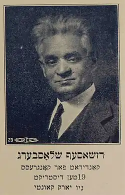 In the 1904 United States House of Representatives election, Schlossberg was the Socialist Labor candidate in New York's 9th congressional district, losing to Democrat Henry M. Goldfogle.[4] In 1908, he was the Socialist Labor candidate in the New York State Assembly's New York County 4th District, losing to Democrat Aaron J. Levy.[5] Although he was not an original founder of the American Labor Party (he disagreed with its endorsement of a capitalist politician, Franklin D. Roosevelt),[6] in 1938 he ran for Congress in New York's 19th congressional district on an American Labor-Socialist fusion ticket, losing to Democrat Sol Bloom.[7] In 1935, Mayor Fiorello La Guardia appointed him to the City Board of Higher Education, sitting on the board until 1963.[8]