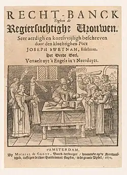 Joseph Swetnam. Recht-banck Teghen de Regiersuchtighe Vrouwen. Amsterdam: Michiel de Groot, 1670.