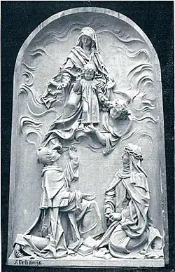 A devout Roman Catholic, Urbania was best known for the sculptures he created for cathedrals and monasteries. Two monumental plaster reliefs – Christ Healing and Daniel in the Lion’s Den – were later moved to the National Gallery of Slovenia in Ljubljana. Small bronze copies of these popular pieces occasionally appear for public sale.[12] Other religious-themed pieces include: a maple wood carving of Christus Ascending (1931, now in Kenosha, Wisconsin);[13][14] several marble statues at the Parish Church of St. Elisabeth, including Immaculata and Two Cherubim (with sculptor Alojzij Progar);[15] St. Hubertus (1909) and St. Anthony and Child (1934);[16] and an important burial chapel piece called Resurrection (1910, made by the artists' group at the Grošlje Workshop for a burial chapel in Škofja Loka), sometimes credited as the sole work of Ivan Zajec.[17]