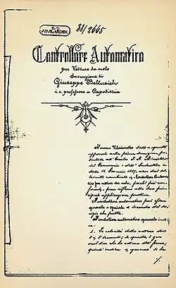 Belušić applied for a patent with the State Patent Office of Vienna in 1888, under the name Controllore automatico per vetture, because his device had other functions beside measuring speed. As mentioned, his device used electrical energy, measured the speed of the vehicle, and recorded the driving time and standing of the vehicle, the number of passengers and the passengers' time of entry and exit.[10][16][4][23][24][25]