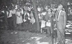 The NDH banned the HSS in June 1941 and detained Maček under house arrest in the village of Kupinec.[11] In the summer of 1941, Torbar met Pavelić and informed him that the HSS would not object to Ustaše holding on to power as long as the Axis powers had the upper hand, provided that there were "smart politics" in place and "compromised Ustaše [were] removed". In return, Pavelić promised reforms and the role of "tolerated opposition" for the HSS, but he did not keep any of these promises.[12] Instead, in late summer or early autumn of 1941, after an envoy of the Nazi Germany Plenipotentiary General to the NDH Edmund Glaise-Horstenau visited Maček in Kupinec to find out if Maček would replace Pavelić, the situation deteriorated for the HSS. Afraid that Germany or Italy would install Maček as head of the NDH, the Ustaše ordered that Maček be taken to the Jasenovac concentration camp on 15 October. He was returned to house arrest in Kupinec in March 1942.[11]