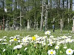 In 1948, the church in Koterka became the parish church because, after the establishment of the Polish-Soviet border, the St. Michael the Archangel Church in Tokary fell within the territory of the Byelorussian Soviet Socialist Republic,[3] where most of the Orthodox residents' houses were also located.[5] In the new political situation, pilgrimages from Belarus became impossible. It was only in 1990 that a solemn procession was organized with the participation of several thousand faithful and 15 priests from the Polish part of Tokary to the Belarusian part. The church continues to be an important pilgrimage center despite the decline in the population of neighboring villages.[1][3] Metropolitan of Warsaw and All Poland, Sawa, presided over the Feast of the Holy Trinity celebrations in Koterka several times,[3][5] and bishops Grzegorz of Bielsko (in 1998) and Jerzy of Siemiatycze (in 2007) also visited the temple.[1] The church was entered into the list of heritage registers on 28 December 1984, under No. A-64.[6] In 2012, the centenary of the construction of the church was commemorated by placing a six-meter cross with a painting by Jarosław Wiszenko, funded by foresters from the Nurzec Stacja forestry, next to it.[5] There are also other wooden votive crosses near the temple.[1]