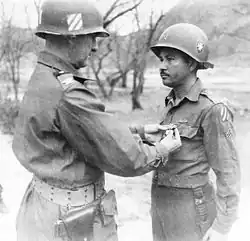 on July 20, 1952, Company "C" was attempting a withdrawal after completing a raiding mission on enemy positions near Chongdong, Korea. In the initial phase of the withdrawal the friendly troops were subjected to intense hostile automatic weapons, artillery and mortar fire from nearby enemy positions. Under the withering fire the men became disorganized and began to move in all directions. Realizing the necessity for the company to effect an orderly withdrawal and evacuate the wounded, Colonel Cordero, the Regimental Commander, continuously exposed himself to the hostile bombardment as he moved among the men, offering encouragement and directing them through the heavy enemy fire. Inspired by his courage, the men assumed the initiative and continued to move toward friendly positions. At this time the ridge line over which the withdrawal was to be made was subjected to heavy artillery and mortar fire. Despite the urging of his executive officer that he seek a place of safety, Colonel Cordero refused to leave his men, and with complete disregard for his personal safety, braved the enemy fire to ensure that all had reached safety and the wounded had been evacuated. Colonel Cordero's gallant and inspirational leadership was instrumental to the success of the withdrawal and reflects the highest credit upon himself and the military service. Entered the Federal Service from Puerto Rico.[7]