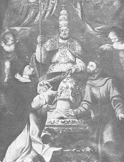 Pope Inocencio III among St. Domingo de Guzmán y St. Francisco de Asís, Atienza, church of La Trinidad.