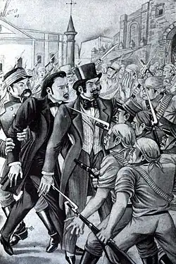On July 15, two days after Major General Pedro Santana had been proclaimed Supreme Chief, Perez went to the Central Board to inform it of its reorganization. During those moments, Pérez had an incident with a supporter of Santana, called Juan Ruiz; Ruiz claimed that the Board had been dissolved after the proclamation of Santana as Supreme Chief and Pérez would protest against this declaration. They went from arguing to threatening each other and then things escalated after they took out their weapons; Santana would intervene to avoid a tragedy but Pérez would shout at him in a threatening manner: "If Rome had a Brutus, Santo Domingo has one too." Some of Santana's officers, believing that it was a plot to assassinate him, rushed out to the Plaza de Armas while shouting: "To arms, to arms; assassinate Santana." The entire population went to the Plaza de Armas; Some people said "the general is dead" and others shouted: "No, nothing has happened to him, General Santana is alive." Pérez was saved from a lynching by the Seyban troops, devotees of Santana, by the intervention of Colonel Felipe Benicio Alfau and was welcomed in the house of the French consul, Eustache Juchereau de Saint-Denys.[4][5]
