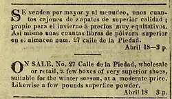 Juan Manuel Canaveris also was dedicated to trade and import, he had a warehouse in the Catedral street 153 (now San Martín).[18] He maintained economic ties with Hodgson & Robinson Co, textile importers from Manchester in Buenos Aires.[19] In 1826, he posted a notice in El Correo Nacional, offering for sale luxury shoes and several pounds of gunpowder.[20]