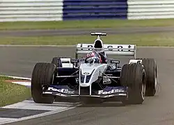 Montoya signed a two-year contract extension to stay with Williams through the end of the 2004 season in mid-2002.[66] His FW25-BMW car was enhanced during the 2003 championship, with the consequent mechanical and aerodynamic changes making it F1's fastest car, particularly when racing in hotter conditions due to benefitting from the Michelin tyres that the team used.[67][68] He led the season-opening Australian Grand Prix until a late-race spin cost him the win to McLaren's David Coulthard and dropped him to second. Montoya added seven more points in the following five races, finishing seventh in San Marino and fourth in Spain. Engineer Frank Dernie's mid-season improvements made the FW25 car competitive, and Montoya won the Monaco Grand Prix. Montoya would put together a title challenge by finishing on the podium in the next seven races, a run that included winning his second and final race of 2003, the German Grand Prix, by over a minute from pole position, a result which moved him into second position in the WDC. His performance declined after the Fédération Internationale de l'Automobile required Michelin to redesign their tyres after it announced changes to the methodology of measuring tyre width, and he was mathematically eliminated from title contention at the season's penultimate round when a drive-through penalty for a third lap collision with Ferrari's Rubens Barrichello at the United States Grand Prix left him to finish down in sixth place.[68] Montoya would end his strongest season in F1 third in the WDC with 82 points, eleven points short of the title.[69]