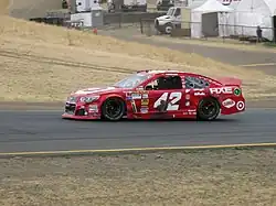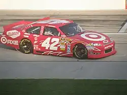 He returned to drive CGR's No. 42 car for the 2008 NASCAR Sprint Cup Series.[121] Montoya was 32nd in the Daytona 500 despite running as high as second late in the race.[122] CGR's decline in performance meant he had no top ten finishes or qualified within the top ten, leading to criticism from Ganassi.[123][124] Jimmy Elledge became Montoya's crew chief after Wingo was moved to teammate Reed Sorenson's squad before being replaced by Brian Pattie.[84] This irritated Montoya, who openly questioned CGR's commitment, and he requested a face-to-face meeting with Ganassi in May 2008, during which his feelings were soothed.[125][126] They promised to work together regularly to make Montoya more competitive.[127] His best season result was a second-place finish in the Aaron's 499 at Talladega.[128] Although Montoya continued to struggle performance-wise attributed in part to the closure of teammate Franchitti's squad due to sponsorship issues,[129] he finished in the top ten at both road course races (sixth and fourth in the Toyota/Save Mart 350 at Infineon and the Centurion Boats at the Glen at Watkins Glen, respectively).[130][131] He took pole position for the Camping World RV 400 at Kansas Speedway, but his lap was disallowed due to excessive gas pressure in his rear shock absorbers.[132] Montoya was 25th in the final championship standings, with 3,329 points.[1]
