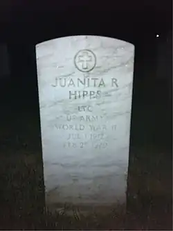 Hipps married United States Army Air Forces officer William Grover Hipps in 1946 and they would go on to have a son, two grandchildren and three great grandchildren.[1][2] William was later promoted to general rank and Juanita followed him on postings around the US, Iran and the Far East.[1] In 1955 she was living in Okinawa, Japan where she became interested in Japanese culture and was an avid collector of antiques.[3] In 1958 she was living with her husband in Redlands, California.[3] Juanita retired from the army in 1969, by which time she held the rank of lieutenant-colonel.[2] She died at her home in St. Petersburg, Florida, on February 25, 1979, and was buried at Arlington National Cemetery with full military honors.[1][2] The US Air Force Association presents the Juanita Redmond Award, their highest nursing award, in her memory.[1][4]