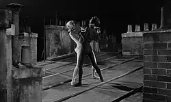 Other themes in contemporary reviews center on the film's black vs white allegorical contrasts, sensuality, and fetishisms. Diana spends much of her time moving cat-like in form-fitting black leotards; a silver dagger attached to her thigh. In the closing minutes of the film, the dark haired villainess is defeated in a lengthy, Manichaean life-and-death struggle on a roof top; not by Judex, but by the blonde circus acrobat, Daisy.[24] Emphasizing the sexuality of the fight and highlighting Franchu's dark vs light, good vs evil theme that runs throughout the film, Daisy, like Diana, is also attired in a form fitting outfit but, in her case it is a skintight, white circus costume. If witnessing the woman vs woman fight-to-the-finish was not sufficiently enticing to the audience, Franju takes the opportunity to lower the camera and offer "...a gleefully sexy and exciting shot showing only their legs, clad in leotards of contrasting black and white, entwining and tangling in the dance of combat."[5] Similarly, another contemporary reviewer noted that the camera angle provided an “erotic-charged shot” where Diana’s legs in black tights and Daisy’s legs in a white acrobatic costume, intertwine.[25]