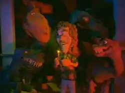When it came time for a video for "Jurassic Park", Yankovic opted to use stop-motion and claymation; he joked during a Q&A that this was because "it's just too hard to find real live dinosaurs these days."[13] "Jurassic Park" was Yankovic's first video that was entirely animated—previous videos, such as "Money for Nothing/Beverly Hillbillies" and "Dare to Be Stupid" had featured elements of animation.[1][14] The video was directed by Mark Osborne and Scott Nordlund.[15] Yankovic initially heard of the duo from Bill Manspeaker, the lead singer of the comedy rock band Green Jellÿ.[1] After being hired for the project, the two "basically turned a private residence in Los Angeles into a clay animation studio."[14] The two worked between July and August 1993, and slept in shifts, so that the final project would be ready for its release in October 1993.[1][14] Yankovic remained hands-off in its creation, allowing the two full creative freedom for the video.[16] One critic noted that the music video seems to have been done in the style of Will Vinton's Dinosaur! A Fun-Filled Trip Back in Time![17] The video parodies scenes from, as well as the general plot of, the 1993 movie, and contains a myriad of sight-gags—as is usual for Yankovic's videos—such as a claymation version of Steven Spielberg running from dinosaurs, Barney having his head bitten off, and a Velociraptor attempting to break down a door, only to realize it has a key.[18]
