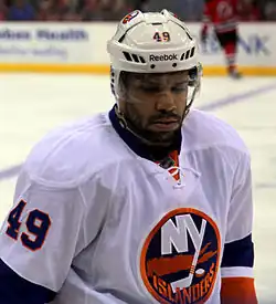On April 11, 2014, at the age of 32, Johnson made his long-awaited NHL debut against the New Jersey Devils at the Prudential Center.[3] Johnson made the best of his call-up to the big leagues, scoring a knockdown of the considerably bigger John Scott two days later in the Islanders' final game of the season. In his retirement essay written for The Players' Tribune in 2016, Scott acknowledged the fight as the only clean loss of his NHL career, congratulating Johnson.[4]