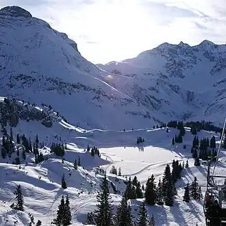 The picturesque lake Körbersee is east of the village Schröcken at 1600 m amsl in Austria. It lies within the "Lechtaler" Alps in Vorarlberg. The lake can only be reached on foot; estimated walking time 45 minutes.[1]
