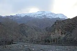 Kūh-Zibad (Persian: کوه زیبد) its peak also called Tir Mahi[1] is a mountain in the province of Razavi Khorasan, city of Gonabad District Zibad in the eastern part of the country, 700 km east of the capital Tehran. The Peak of the Moantain is called Qole -e Tir Mahi is 2,557 metres (8,389 ft) above sea level, or 431 m (1,414 ft) above the surrounding terrain . The width at the base is 5.5 km. The terrain around the Qole-e Tir Mahi and Kuh-e zibad is mainly hilly. The highest point in the vicinity is 2775 meters above sea level, 17.7 km southeast of Qole-e Tir mahi. The area surrounding Kuh-e Zibad is very sparsely populated, having only 5 inhabitants per square kilometer, with the nearest settlement of any size being the village of Zibad, 8.5 km to the north of the mountain. The terrain abutting Kuh-e Zibad is largely barren, with little or no vegetation, thanks to its cold steppe climate and yet - unusually - boasts many named mountains and valleys. The average annual temperature in the area is 17 °C with the warmest month being July when the average temperature is 30 °C, and the coldest, January, with 1 °C. The average annual rainfall is 211 mm (8 in) with the rainiest month being February, with an average of 58 mm (2 in) of precipitation, and the driest, July, with 1 mm. Thanks to a celebrated episode in the poet Ferdowsi’s colossal epic Shahnameh the mountain is famed as the site of Davazdah Rokh (the legendary Battle of the Twelve Combats) and its eastern part is known as The Black Mountain or Kūh-e Gonabad. The long mountain range is called Qohestan and it extends from Bajestan to Birjand near the border with Afghanistan. This mountain range separates south khorasan from Razavi Khorasan, part of this mountain range near Kakhk is called black mountain or kuh e gonabad.