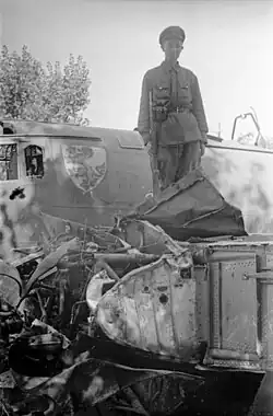 The opening day of the campaign resulted in the loss of seven aircraft.[62] III. Gruppe attacked airfields at Łuck and Mlynow, near Dubno.[61] The next day an 8./KG 55 Heinkel was shot down by flak over Łuck, the crew bailed out but were later found by advancing German forces to have been shot in the head. Two of the men were found at the local Commissar's house.[62] II. Gruppe attacked airfields in L'vov, Adamy, near Busk, Ukraine, and Zalosy. III./KG 55 bombed airfields in Dubno and Kiev that morning. The Luftwaffe established a degree of air superiority after destroying and capturing over 4,000 Soviet aircraft in the first weeks of the invasion.[63] II./KG 55 attacked airfield near Kiev again on 25 June while III. Gruppe bombed Red Army troop concentrations in Wlodzimierzec-Lutsk area on 23 June followed by bombing attacks on the Kowel-Sarny rail system on 25 June.[61] By 25 June Fliegerkorps V bombed 77 airfields in the first three days, in 1,600 sorties.[64] The air corps claimed 774 Soviet aircraft on the ground.[64] Army reconnaissance units and the air corps lost 55 aircraft destroyed and 37 damaged.[65]