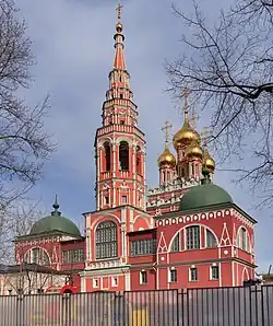 A wooden church on this site was documented as early as 1493.[1] The elongated five-domed church with an elegantly "laced" belfry was constructed between 1687 and 1695. The interior was frescoed in the late 17th century. Napoleon's soldiers desecrated the church, turning it into a stables.[1] In the 19th century, the icon screen was restored, the galleries and apses were expanded, and several outsize domed porches were added. The church was closed by the Soviets in 1934 and was adapted for accommodation of a KGB archive. It was not returned to the Russian Orthodox Church until December 2006.