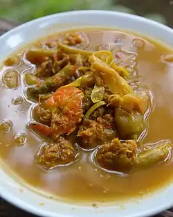 Kaeng som, gaeng som[1] (Thai: แกงส้ม, pronounced [kɛ̄ːŋ sôm]), Asam rebus, or Thai/Lao/Malaysian sour curry[2] is a sour and spicy fish curry or soup with vegetables popular in Southeast Asia.[3] The curry is characteristic for its sour taste, which comes from tamarind (makham). The recipe uses palm sugar (Thai: น้ำตาลปี๊บ, namtan pip) to sweeten the curry.