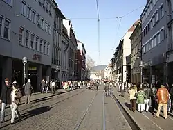 The street begins in the north of Freiburg at Siegesdenkmal, which is located on the outskirts of the historic city center. From the central street crossing, at Bertoldsbrunnen, Bertoldstraße branches off westwards and Salzstraße eastwards. On the southern outskirts of the historical city center Kaiser-Joseph-Straße passes through the Martinstor gate and continues on to Kaiserbrücke, which crosses the Dreisam. Like many other streets in downtown Freiburg, Kaiser-Joseph-Straße has a Bächle. Most of the buildings between Siegesdenkmal and Martinstor were completely destroyed in World War II during an air raid on 27 November 1944. Because of the tram, which opened in 1901, the people in charge had to build arcades into the buildings on either side of the street in order to create more space for pedestrian and other traffic, so the tram could continue passing through the Kaiser-Joseph-Straße. Traffic was regulated by traffic lights located at Bertoldsbrunnen.[2] In November 1972,[3] the street became one of the first traffic-calmed areas for pedestrians in Germany. Only tramline 2 (Zähringen-Günstertal), tramline 3 in the south (Vauban-Haid), as well as tramline 5 (Rieselfeld-Hornusstraße) and certain delivery vehicles are allowed to use this street now. These restrictions do not affect the part of Kaiser-Joseph-Straße which is located south of Martinstor.
