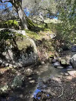 Kaiser Creek flows through a steep canyon flanked by rounded hills covered in chaparral and woodlands. Dense forests of Coast live oak, Valley oak, California bay and California buckeye cover the shaded areas in the Kaiser Creek watershed while open grasslands predominate on exposed slopes.[2][5] The creek and its tributaries are shaded by a variety of oaks and laurel, White alder and Arroyo willow.[5] White alder in particular are the dominant streamside tree along much of Kaiser Creek. Higher elevation areas in the watershed on Rocky Ridge have extensive areas of chaparral and large outcrops of sandstone.