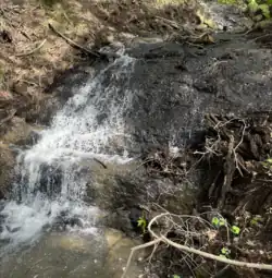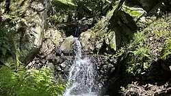 Kaiser Creek begins as a number of springs and seeps along the crest of Rocky Ridge at an elevation of 2,024 feet (617 m)[3][2] in the EBMUD San Leandro watershed. In its initial course, Kaiser Creek has a steep descent westward through a narrow canyon carved out of the Briones Sandstone. A series of waterfalls define the upper course of Kaiser Creek, where it has eroded through the uplift that forms Rocky Ridge.