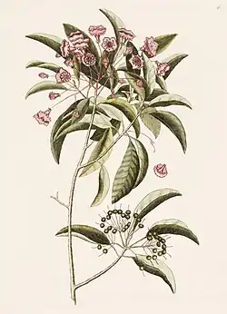Kalmia latifolia was named and described by the renowned Swedish botanist Carl Linnaeus in 1753.[6][7] In his description, Linnaeus referred to an earlier description and illustration of Chamaedaphne foliis published by the English naturalist Mark Catesby in 1743.[8] Catesby's illustration was designated as the lectotype of Kalmia latifolia L. in 1993.[9]