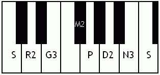 It is the 5th ragam in the 11th chakra Rudra. The mnemonic name is Rudra-Ma. The mnemonic phrase is sa ri gu mi pa dhi (or 'di') nu.[2] Its arohana-avarohana structure is as follows (see swaras in Carnatic music for details on below notation and terms):