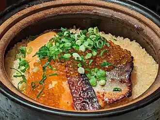 Kamameshi (釜飯 "kettle rice") is a Japanese rice dish traditionally cooked in an iron pot called a kama. Many varieties exist, but most consist of rice seasoned with soy sauce or mirin, and cooked with meats and vegetables. In modern times, it is often considered a type of takikomi gohan (mixed rice dish).