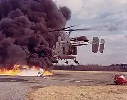 During the conflict, the HH-43 flew more rescue missions than all other rotorcraft combined, largely due to its unique hovering capability; between 1966 and 1970, the type performed a total of 888 combat rescue, comprising 343 aircrew rescues and 545 non-aircrew rescues.[7] The type was also occasionally used as a firefighting vehicle in the theatre as well.[18] Noting the shortcomings of the HH-43, the procurement of newer aircraft, such as the Sikorsky CH-3C and HH-3E, was accelerated; their arrival in quantity supplanted the type and saw its being entirely replaced during the early 1970s.[19][20] However, the HH-43 did continue to serve in Southeast Asia until 1975, making it both the first and last rescue helicopter serving in that theatre.[16] (See also List of aircraft losses of the Vietnam War)