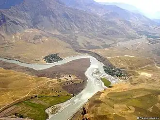 View of Khwahan district and two of its villages, Kamar and Kaji, as well as the Panj river.