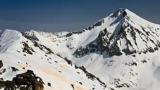 Kamenitsa (Bulgarian: Каменица [ˈkamɛnit͡sɐ]) is a peak in the Pirin mountain range, south-western Bulgaria. It is located in the northern part of Pirin on the 22 km-long Kamenitsa secondary ridge between the summits of Malka Kamenitsa to the north and Yalovarnika (2,763 m) to the south.[1] Its height is 2,822 m which ranks it on fifth place in Pirin, behind Vihren (2,914 m), Kutelo (2,908 m), Banski Suhodol (2,884 m) and Polezhan (2,851 m).[1][2] The peak is built up of granite blocks covered in lichens.[2]