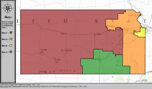 Table of United States congressional district boundary maps in the State of Kansas, presented chronologically.[3] All redistricting events in Kansas between 1973 and 2013 are shown.