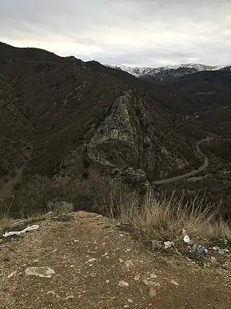 The Kapilikaya Rock Tomb is located between Laçin and Kırkdilim,[2] 27 km north of Çorum, Turkey, on a rocky, steep and rough land formed by rift valleys cracked by river, on the north- west corner of a rock which extends to the north.[1] A steep trail ascends the left side of a rocky outcropping, culminating in stairs before a tomb. Access to its inner chamber is through a small square opening halfway up.[3]