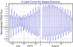 Kappa Draconis is a single-lined spectroscopic binary.[11] The main Be star is orbited by another stellar companion, on a circular orbit with a period of 61.555 days.[12] The General Catalogue of Variable Stars lists Kappa Draconis as a Gamma Cassiopeiae type star, a type of eruptive irregular variable star, whose visual magnitude varies from 3.82 to 4.01.[13] However Balona and Dziembowsk classify it as a Zeta Ophiuchi star, a type of pulsating variable star, with a primary period of 10.4 hours.[14]