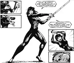 The character was created by plotter Kevin Eastman, plotter-writer Peter Laird and writer-artist Jim Lawson, first appearing in cameos as an unknown woman in Mirage Studios' Teenage Mutant Ninja Turtles #53 (November 1992) and Teenage Mutant Ninja Turtles #54 (December 1992), and being named Karai in Teenage Mutant Ninja Turtles #55 (January 1993). She is introduced as one of the leaders of the mainstream Foot Clan in Japan (a member of its Council of Five) who came to New York City to restore order in the 1993 "City at War" story arc.[5][6][7] Ever since Leonardo killed the Shredder (Oroku Saki), the Foot faction in NYC has been in chaos, with different groups warring with one another for ultimate control, save for Shredder's Elite, who have been carrying out seemingly motiveless attacks on the other factions. Shortly after arriving in New York, Karai captures Leonardo and offers the TMNT a deal: if the Turtles destroy the Elite, she will offer them a truce with the Foot Clan. After debate, the Turtles finally agree to seek Karai's assistance in dealing with the Elite.[8][9] As they reach her skyscraper headquarters, they find dead Foot guards and the Foot's leader cradling a girl's corpse. It is revealed that the girl was Karai's daughter, and in despair, she makes Leonardo swear he will help her kill all of the Elite.[10] During a final confrontation, five Elite face off against the Turtles, Karai, and her Foot Soldiers. The disguised Karai, wearing the Shredder's armor, orders the Elite to commit seppuku, but only one does. After an ensuing hard fight, the Turtles and Karai are the only ones left standing. Karai thanks the Turtles for their help, but they answer she owes them nothing but her word, to which she agree, saying that "no longer will the Foot Clan bother you", and returns to Japan.[11][12][13] [Note 2]