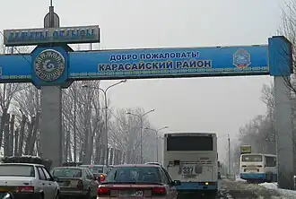 The welcome-sign at the entrance to the Karasay district from Almaty city