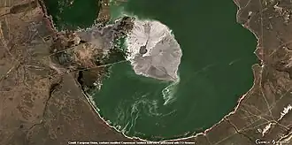 Large quantities of ash are dumped into lake Karasor by the two neighboring power plants. The accumulation of dumped ashes in the southern part of the lake forms an island or peninsula with an average diameter of 2.5 kilometers (1.6 mi). The ashes are collected by people of the neighboring villages in order to sell them to be recycled for the industrial production of aluminosilicate microparticles.[3][4]