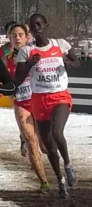Jasim began 2012 with a personal best at the Marrakesh Half Marathon, running a time of 71:06 minutes for second behind Asmae Leghzaoui.[14] A 25th-place finish at the 2011 IAAF World Cross Country Championships helped Bahrain to fourth in the team rankings.[15] She formed a Bahraini 1–2 over 10,000 m behind Shitaye Eshete at the 2011 Asian Athletics Championships[16] She was third behind Kenyan opposition in the 5000 m at the 2011 Military World Games (repeating her finish from 2007) and ended the year with a runner-up finish to compatriot Lishan Dula at the 2011 Pan Arab Games half marathon.[17][18]