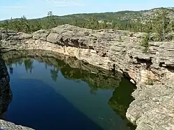 Lake Shaitankol is one popular areas in the park. The lake got its name, which translates to "Devil's Lake", allegedly due to a high number of hunters getting lost in the area, sparking rumors that the devil was at work.[2] The lake is located at 1200m above sea level and is 5 km (3.1 mi) west of the city Karkaraly. You reach the lake on the eco-trail “The Legend of Lake Shaitankok.” The lake is accessible by foot and generally takes 5 hours round-trip. The lake is oval in shape and surrounded by rock cliffs up to 10m high. The depth of the lake is unknown. The water level does not decrease throughout the year because it is fed underground water and precipitation.