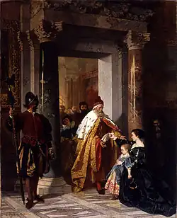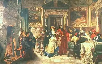 Later in life, he made many visits to Venice to study paintings drawn from life in the 15th and 16th centuries. The chief characteristics of his manner are historical fidelity, skillfulness of technique, and richness of coloring. His works include "Belisarius as a Beggar" (1850), "Jeweler at a Venetian Senator's" (1855), "Visit of Sebastian del Piombo to Titian" (1861), "Doge in Council" (1864), "Charles V and Fugger" (1870), "Dürer in Venice" (1873), "Charles V Visiting Titian" (1873), "In the Picture Gallery" (1874), "Bianca Capello" (1874), "Scene from the Marriage of Figaro" (1874), "Emperor Maximilian Receiving the Venetian Embassy" (1877), and frescos for the Neues Museum in Berlin.
